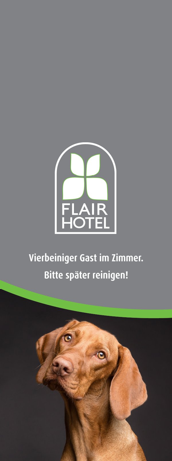 Druck: „Vierbeiniger Gast im Zimmer. Bitte später reinigen“ mit Foto und Flair Logo auf Vorder- und Rückseite